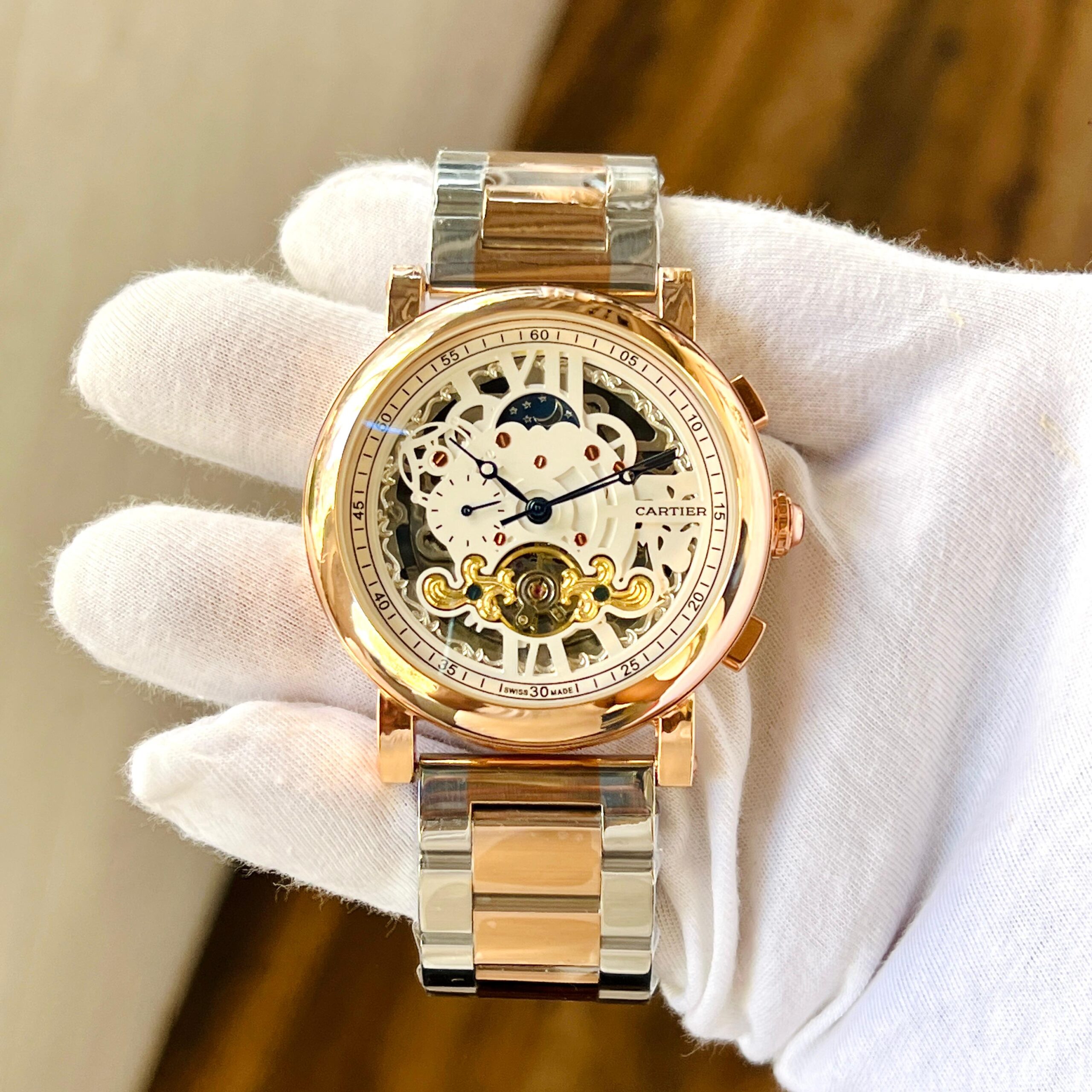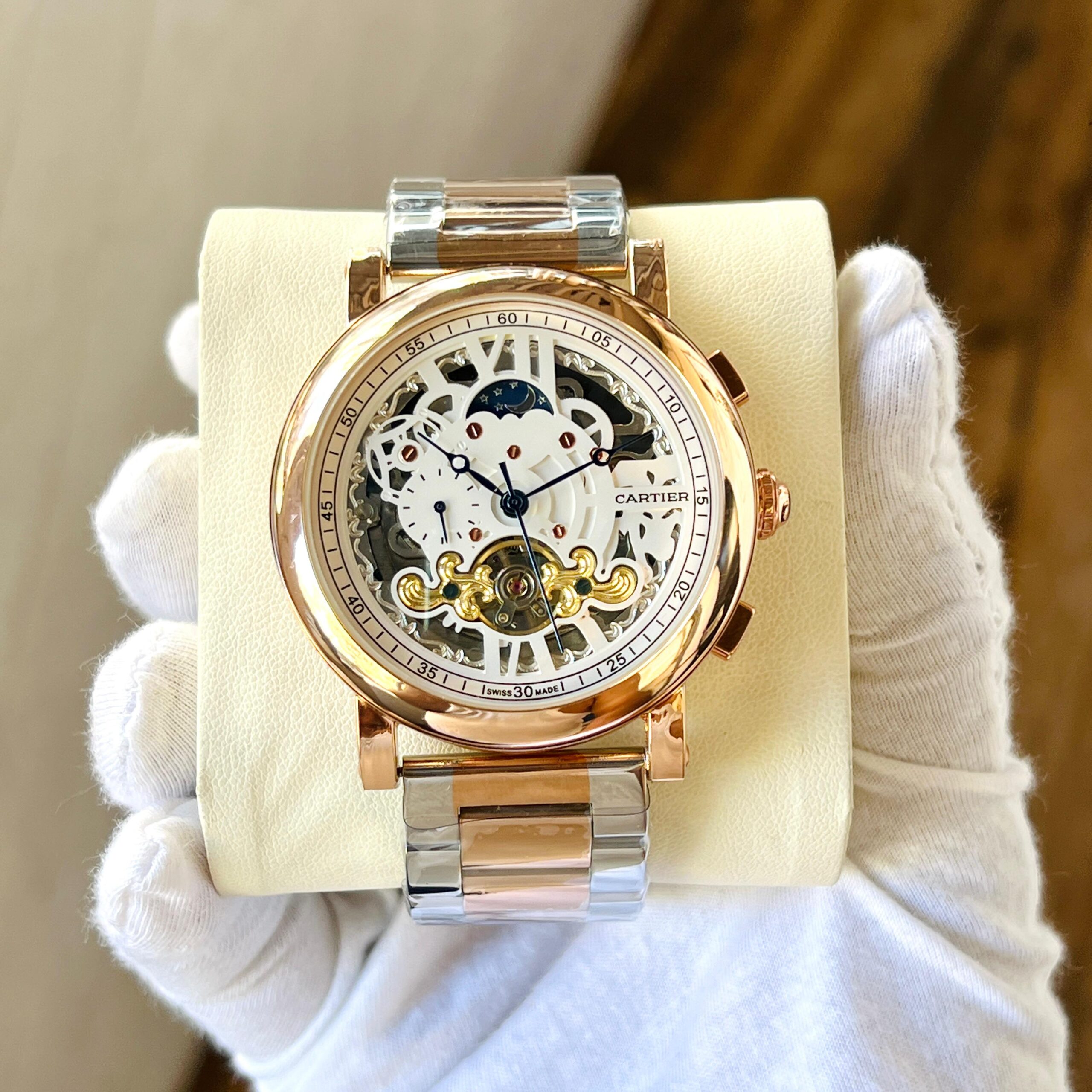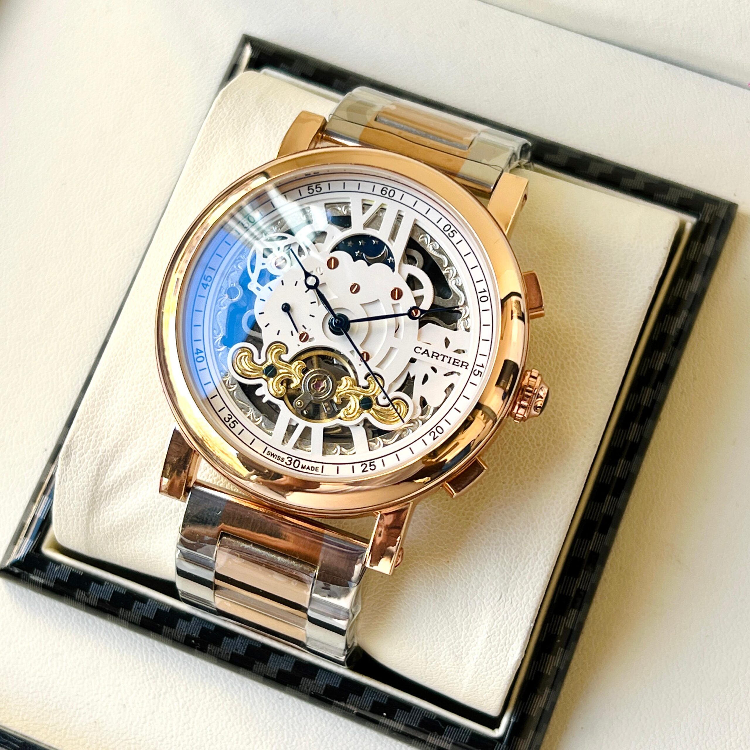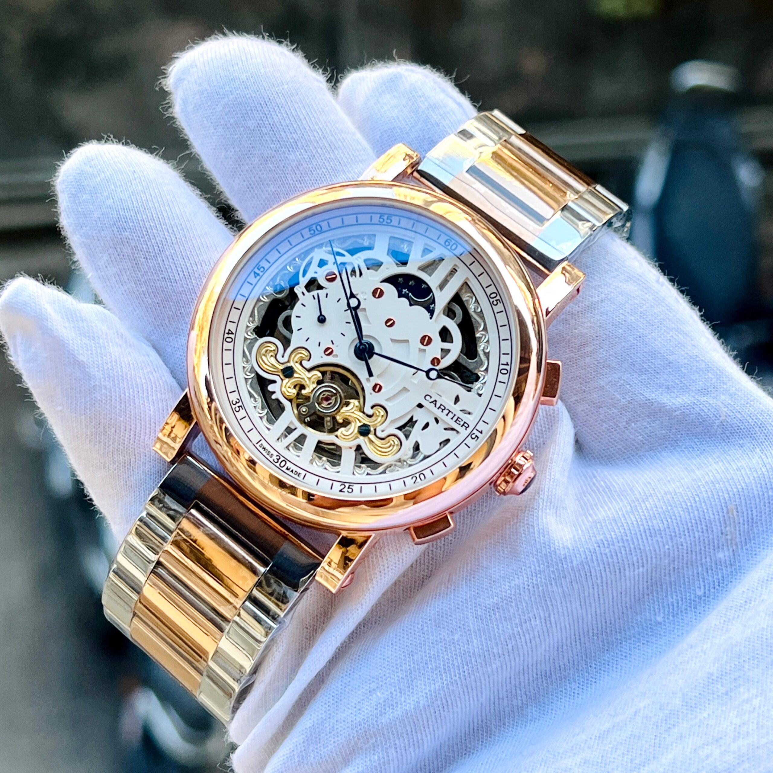 This Cartier automatic skeleton men’s watch is designed for those who appreciate luxury and mechanical craftsmanship. The open skeleton dial reveals the intricate automatic movement inside, creating a high-end, sophisticated appearance.