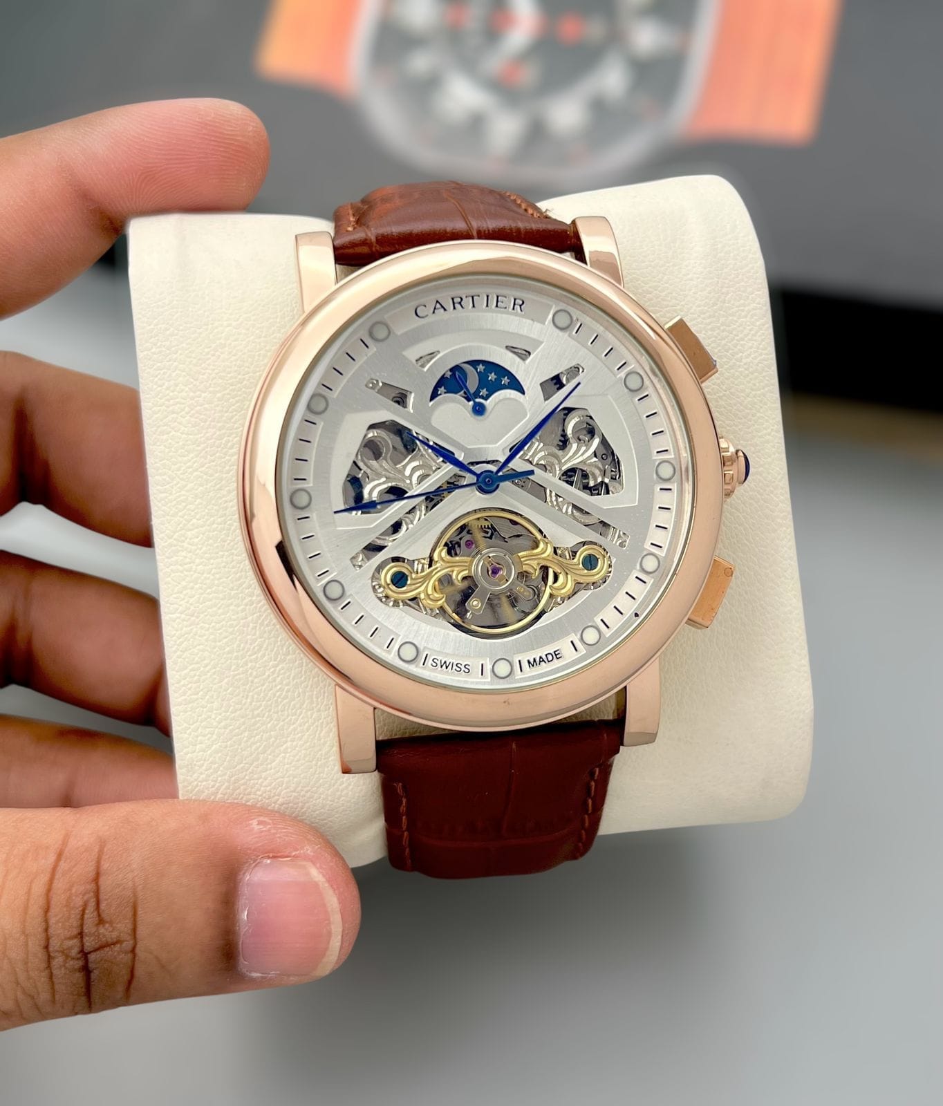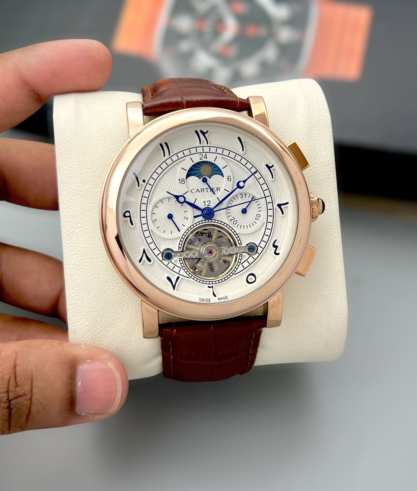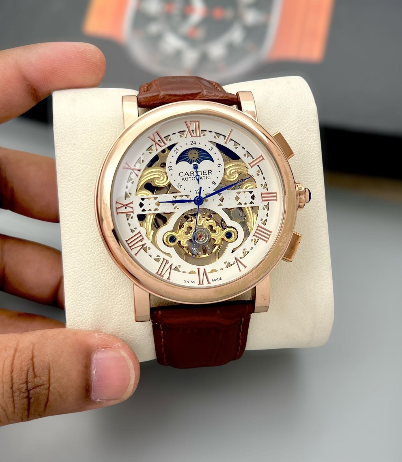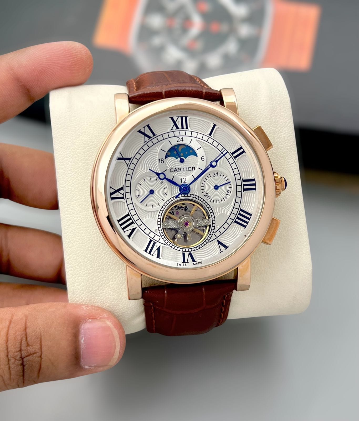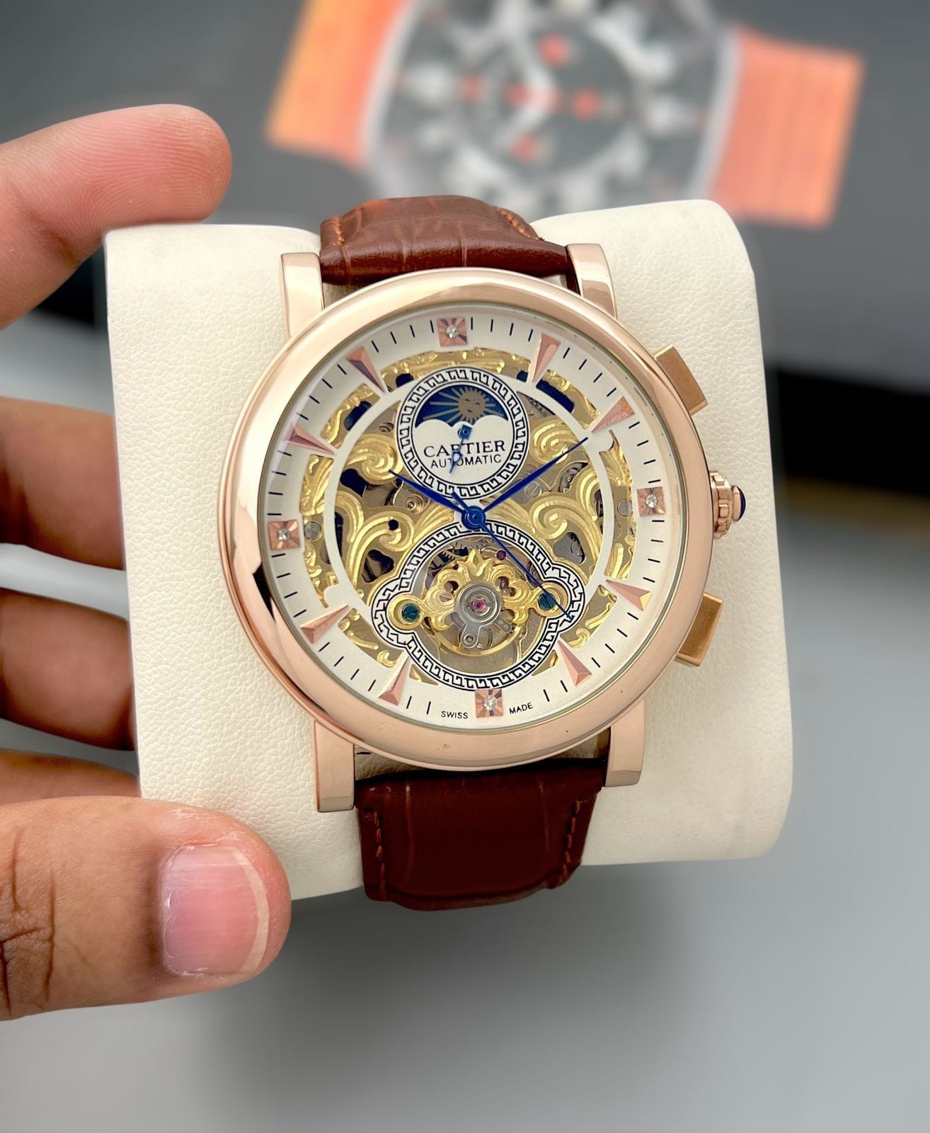 Cartier Tourbillion, Automatic its heavy rose-gold stainless-steel case, transparent back, and premium tan-brown leather strap create a commanding yet refined look. Designed to stand out, this watch is ideal for men who appreciate mechanical artistry, bold proportions, and statement luxury.