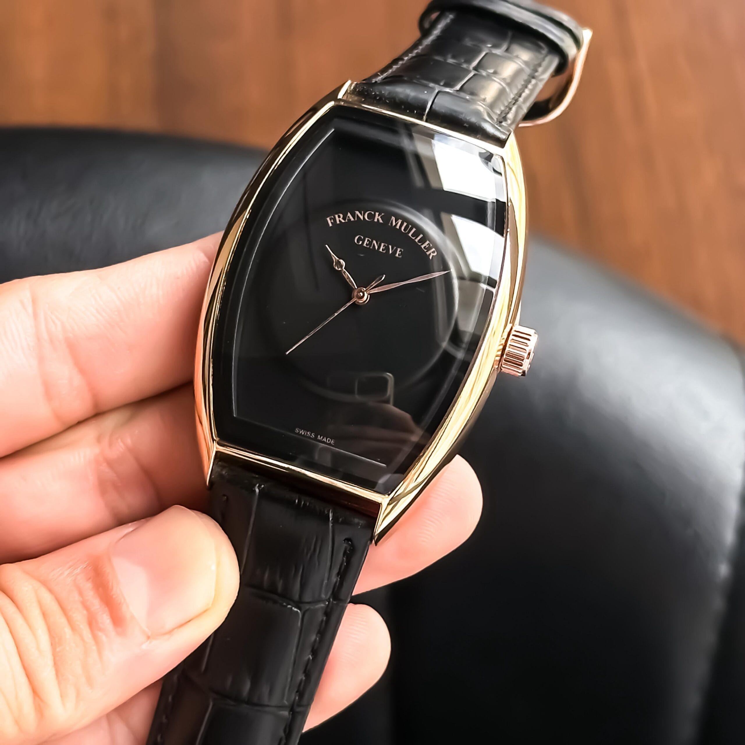 With a rose-gold stainless steel case, deep black piano dial, and premium leather strap, the Franck Muller Curvex CX delivers a powerful wrist presence while maintaining classic sophistication. Driven by a Swiss Made quartz movement, it offers precision, reliability, and effortless daily wear.