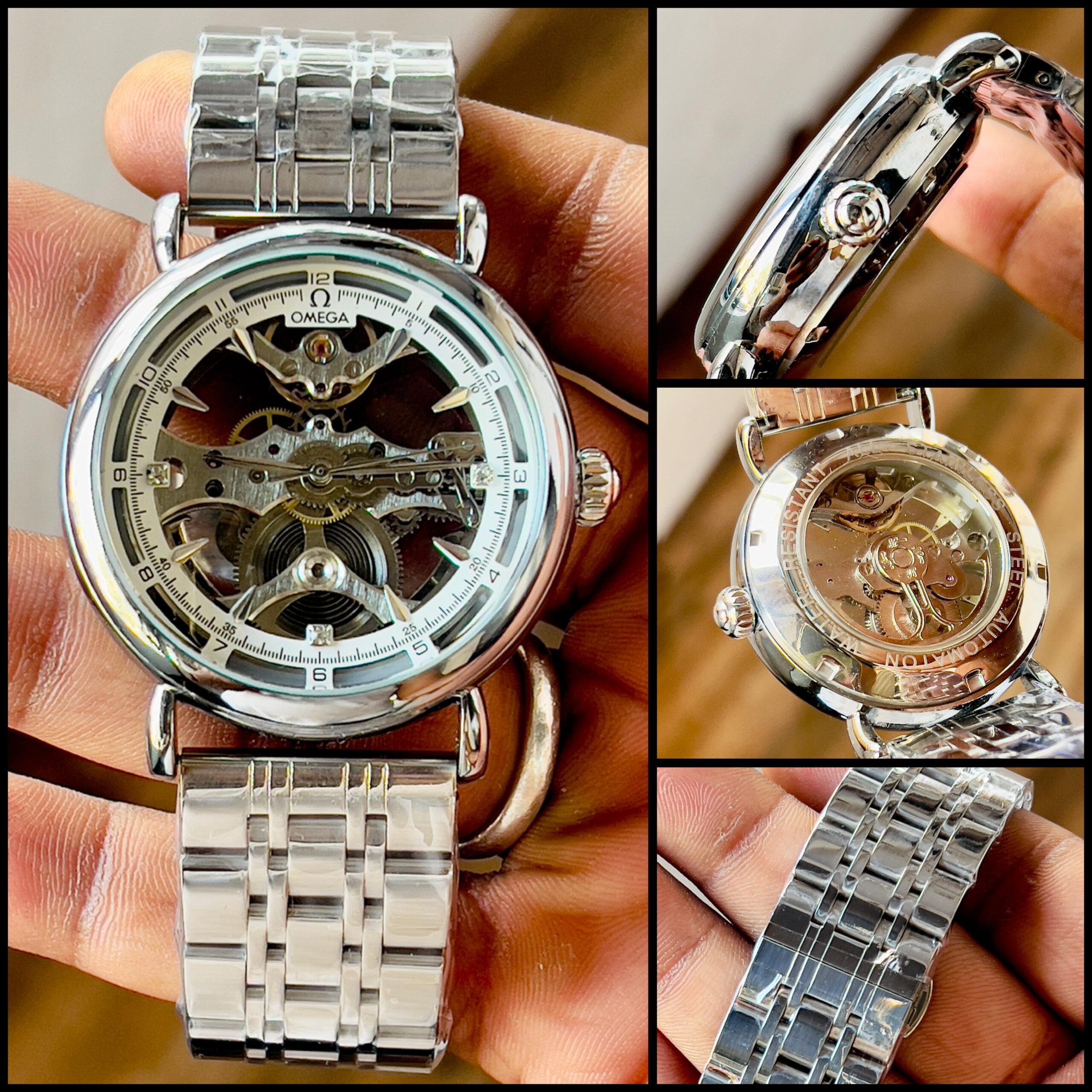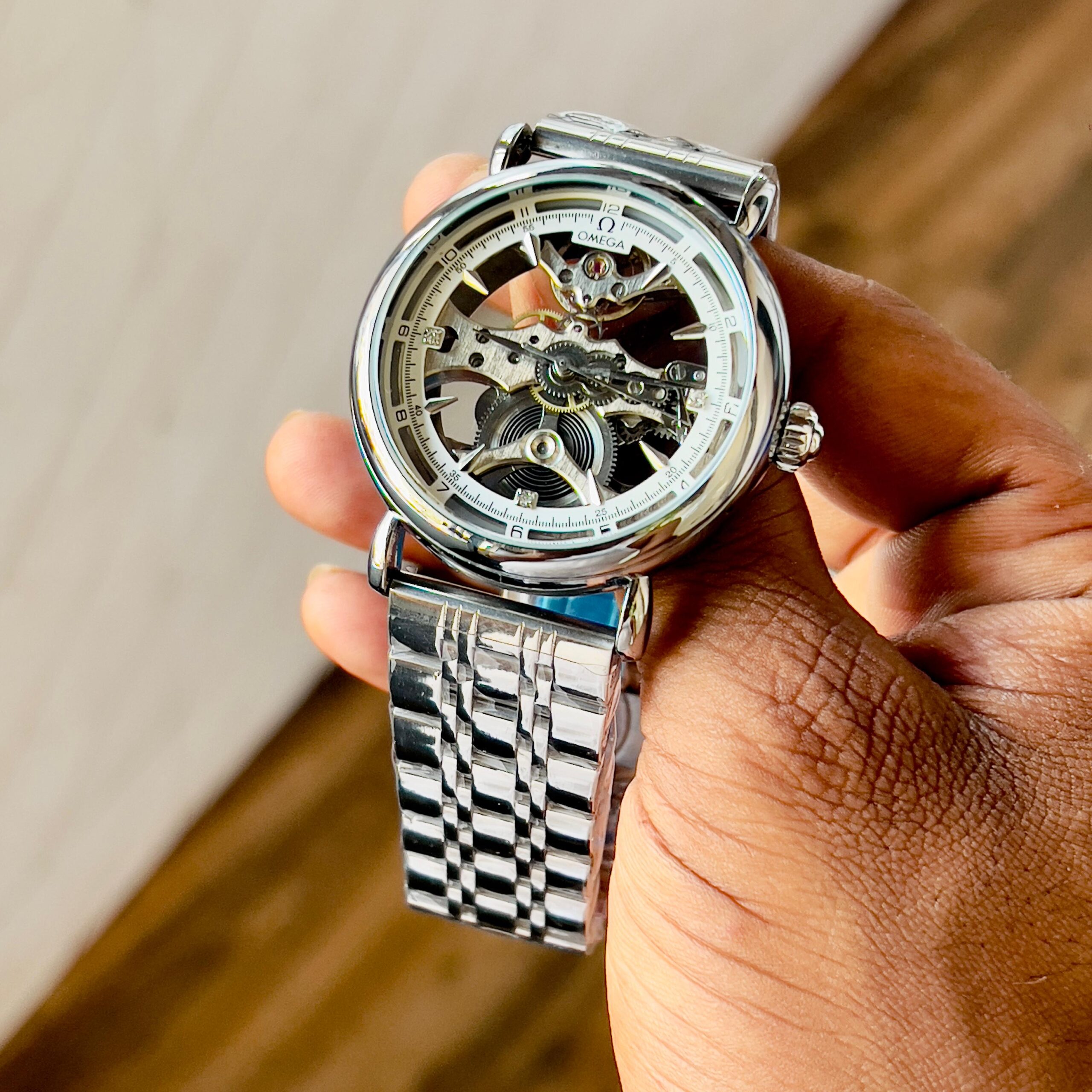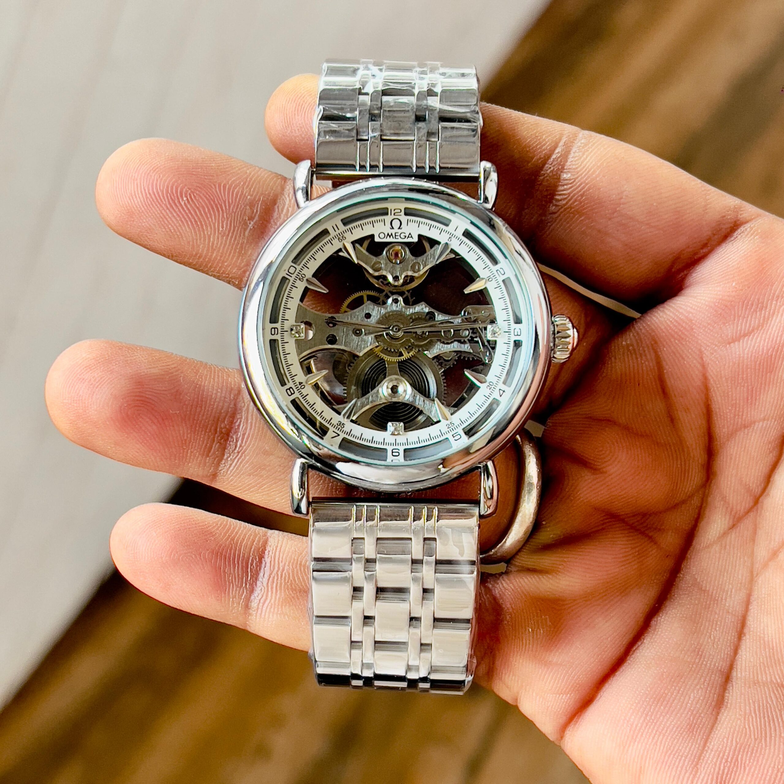 Omega automatic Skeleton Dial Automatic Men Watch is designed for watch enthusiasts who appreciate mechanical craftsmanship and luxury styling. The watch features a fully visible skeleton dial that reveals the intricate automatic movement working inside the timepiece.