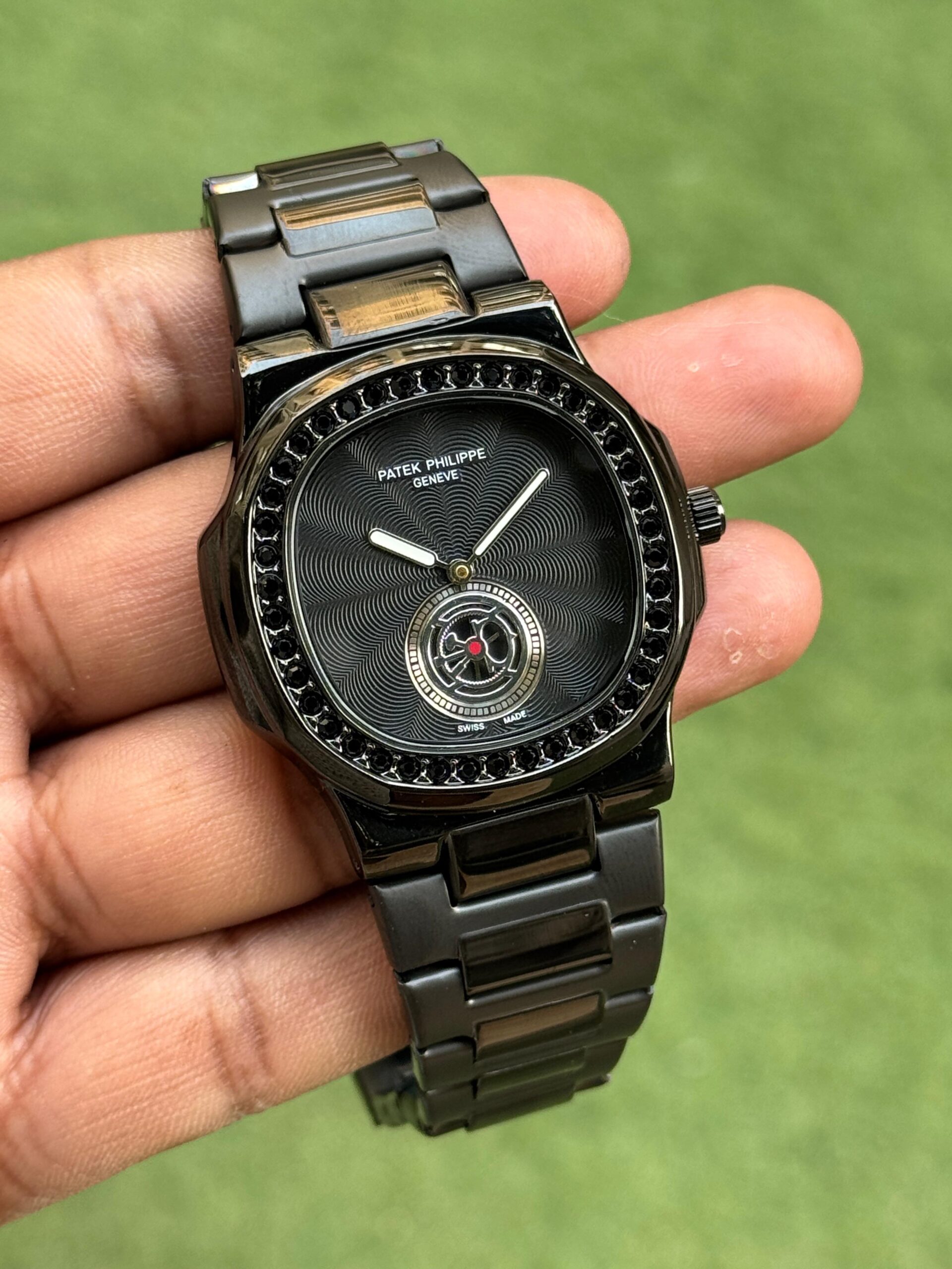 The integrated black metal bracelet complements the case perfectly, creating a seamless luxury sports style design. The watch is powered by reliable quartz movement ensuring accurate and consistent timekeeping for daily use. Available through Nexelcart, this Patek Philippe inspired watch is ideal for men who want a modern luxury statement watch with unique dial texture and elegant all-black styling.