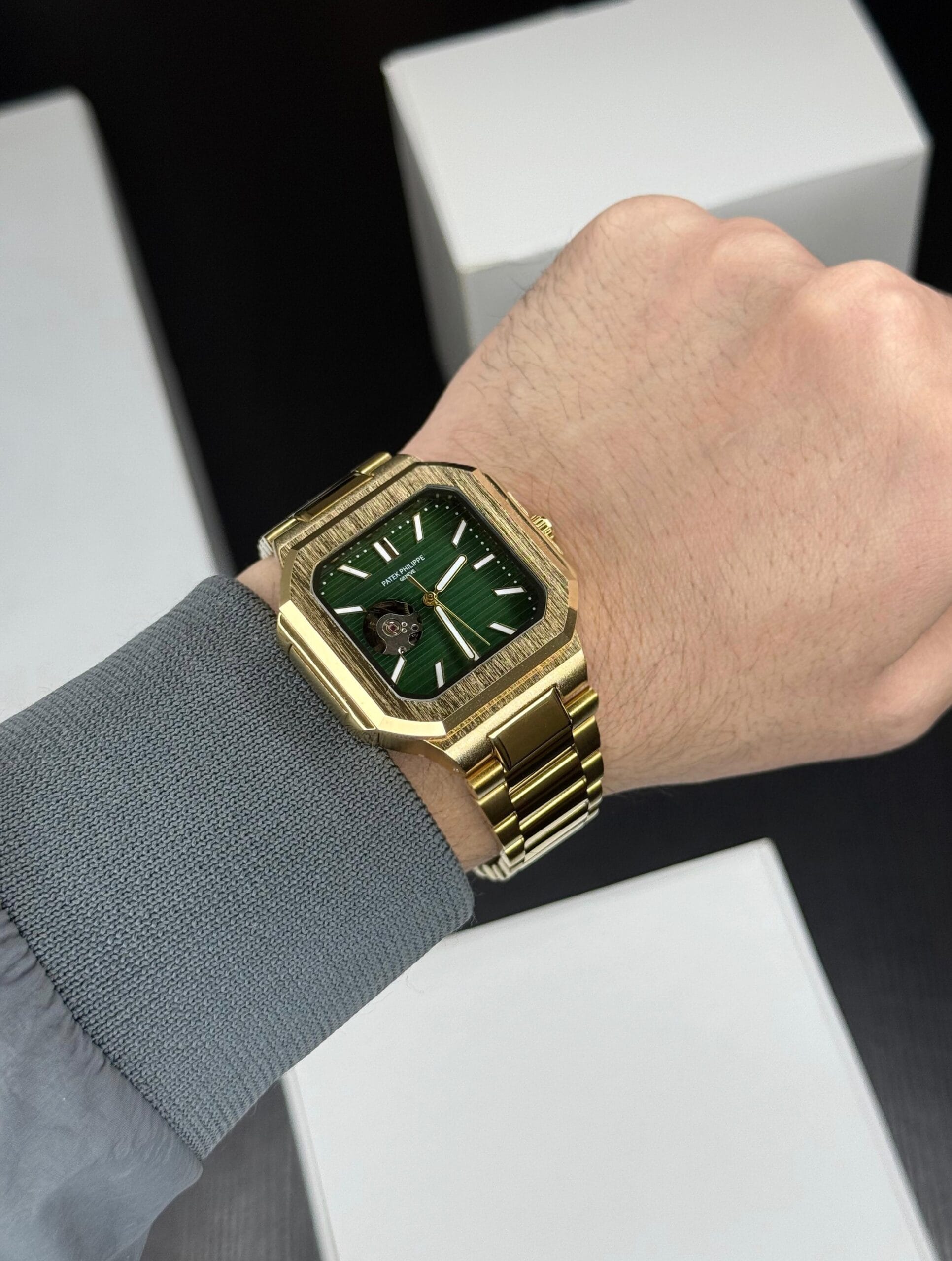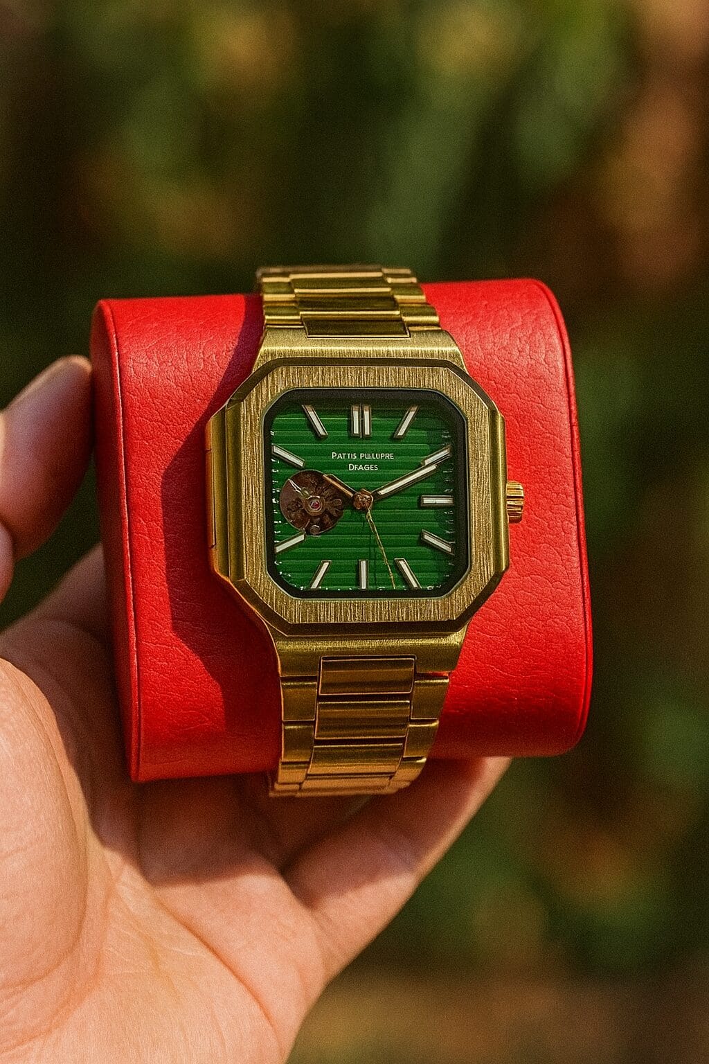 Patek Philippe Geneve 7AA, Automatic Men’s Luxury Skeleton Watch a hot-selling premium model, this Patek Philippe Geneve Skeleton watch features a stunning open-back mechanical design paired with a rich golden band—delivering a bold luxury look. The 7AA quality build and automatic movement make it a true standout for men who prefer elegance with engineering beauty.