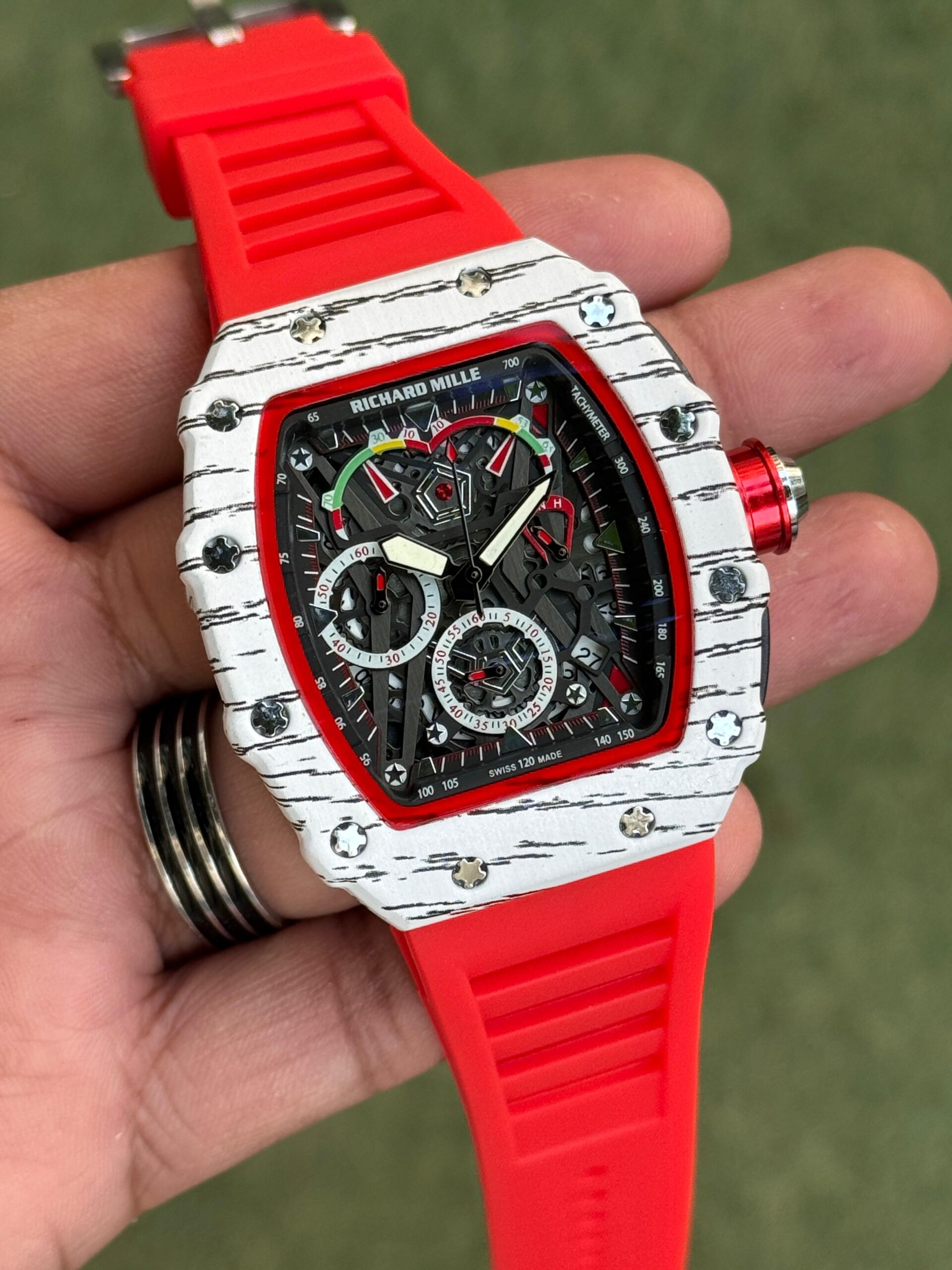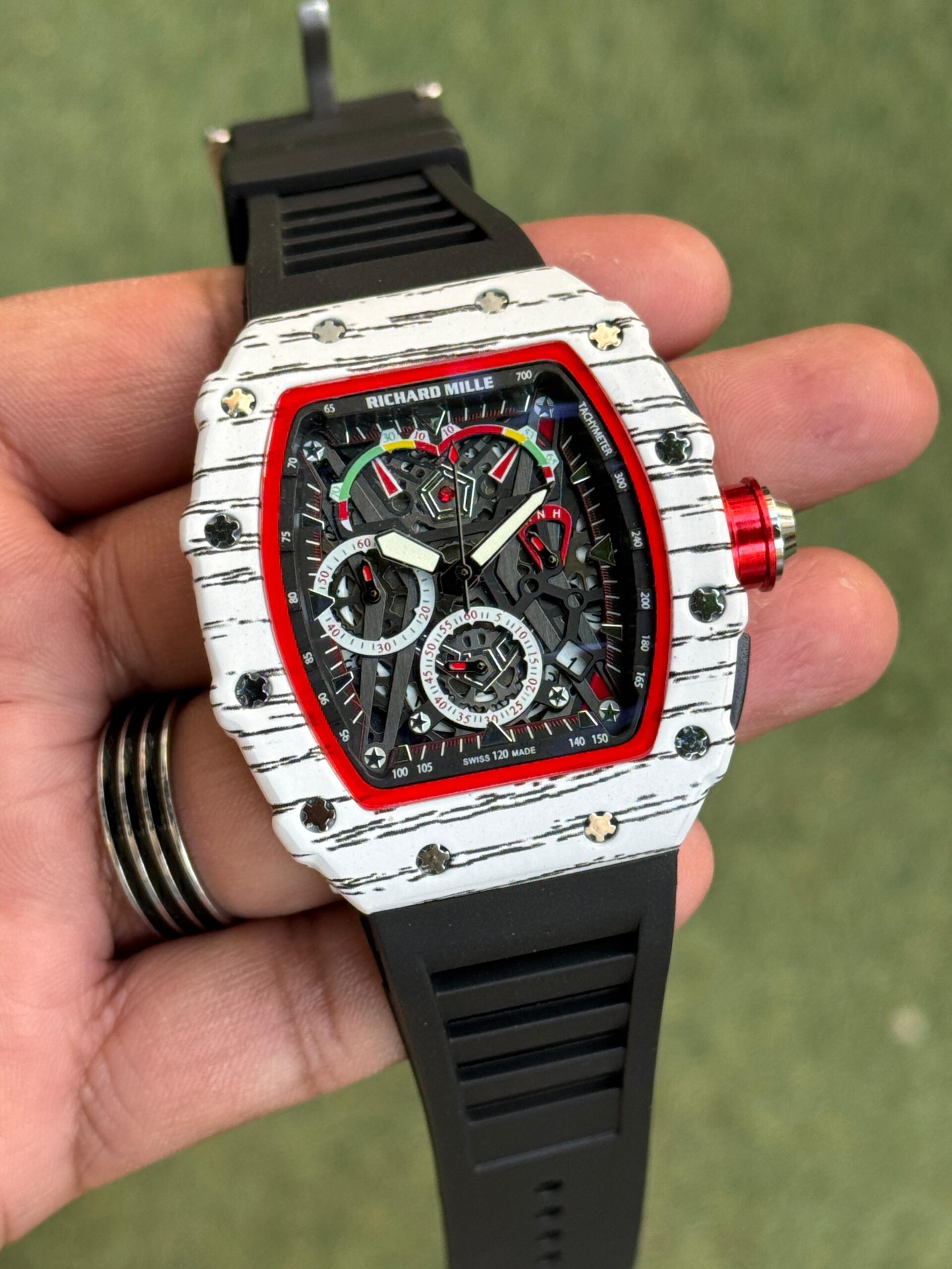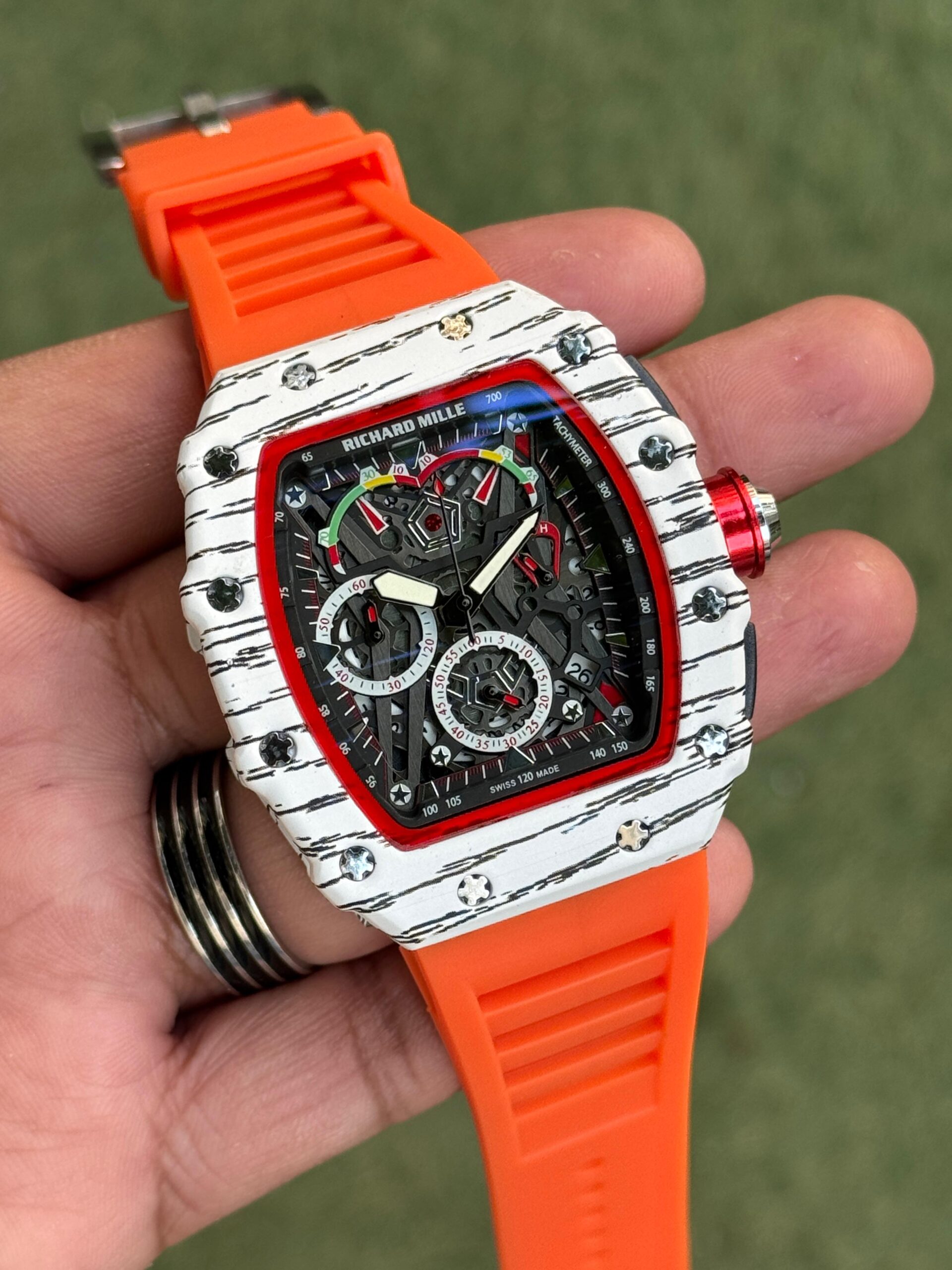 The durable rubber strap offers maximum comfort and flexibility, making the watch ideal for daily wear and active lifestyle. With its bold racing look, skeleton dial and high-tech design language, the Richard Mille RM 50-03 McLaren Chronograph stands out as a powerful luxury statement watch.