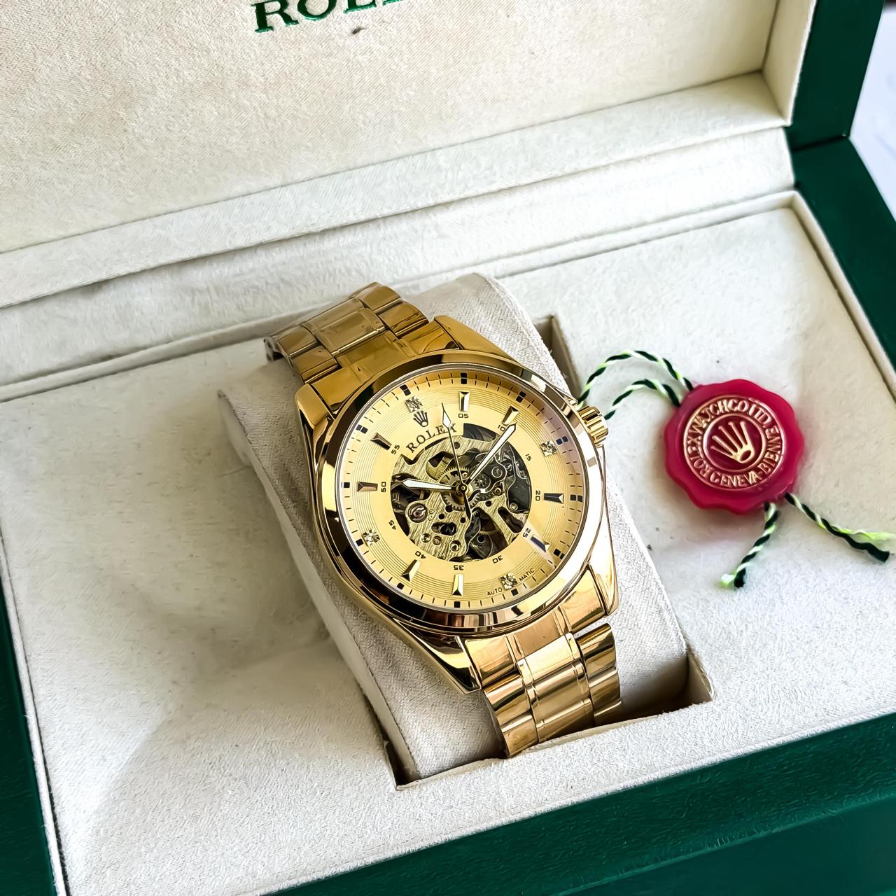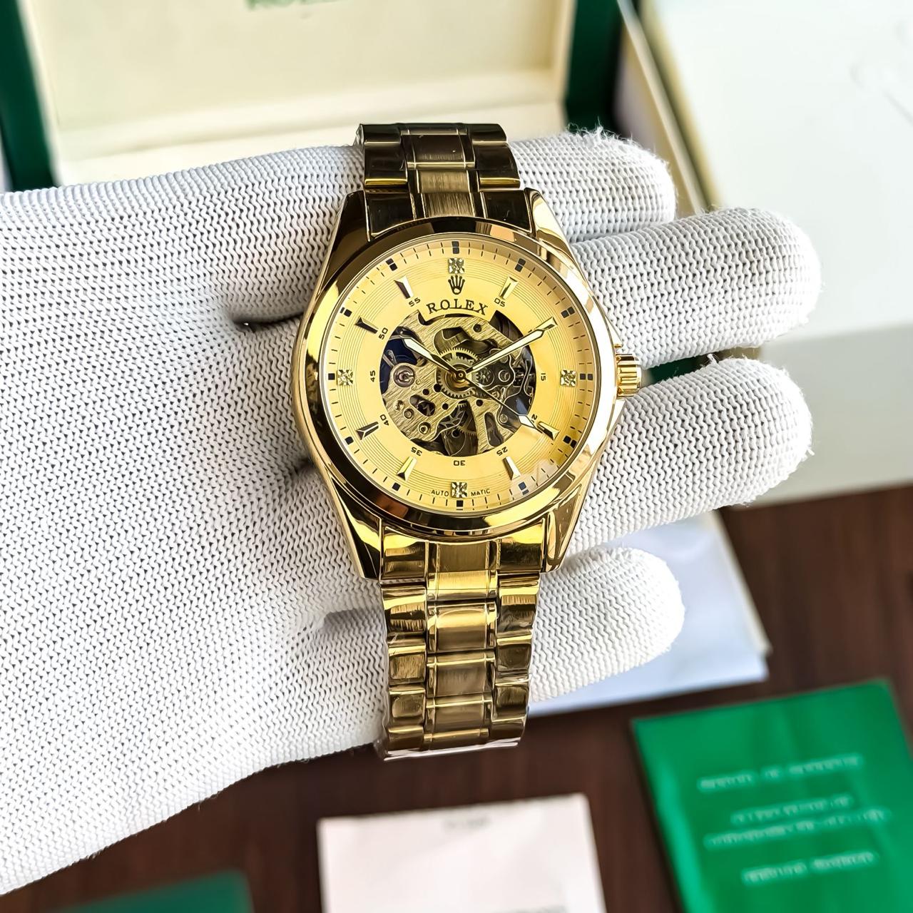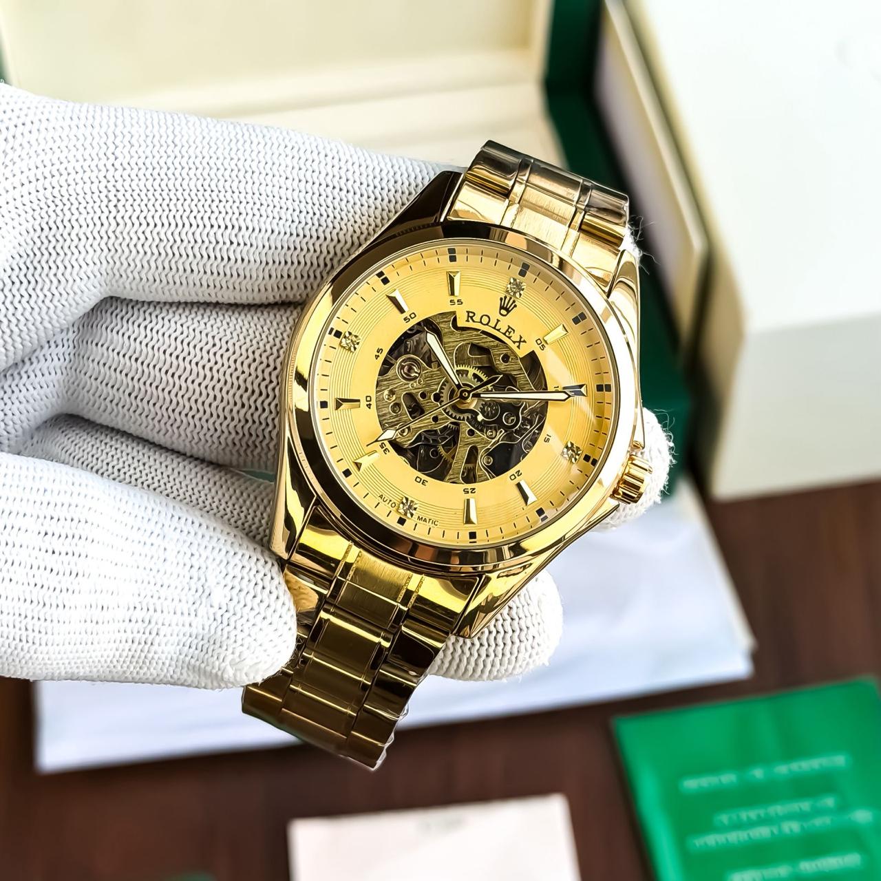 Rolex 7A Automatic skeleton a perfect blend of classic Rolex styling and modern skeleton design, this premium timepiece is crafted for men who want a bold luxury look. Rolex 7A Automatic is The transparent skeleton dial showcases the inner automatic machinery, giving a rich and mechanical feel on the wrist. Finished in a full gold tone with a solid stainless steel chain, this watch stands out in both casual and formal wear.
