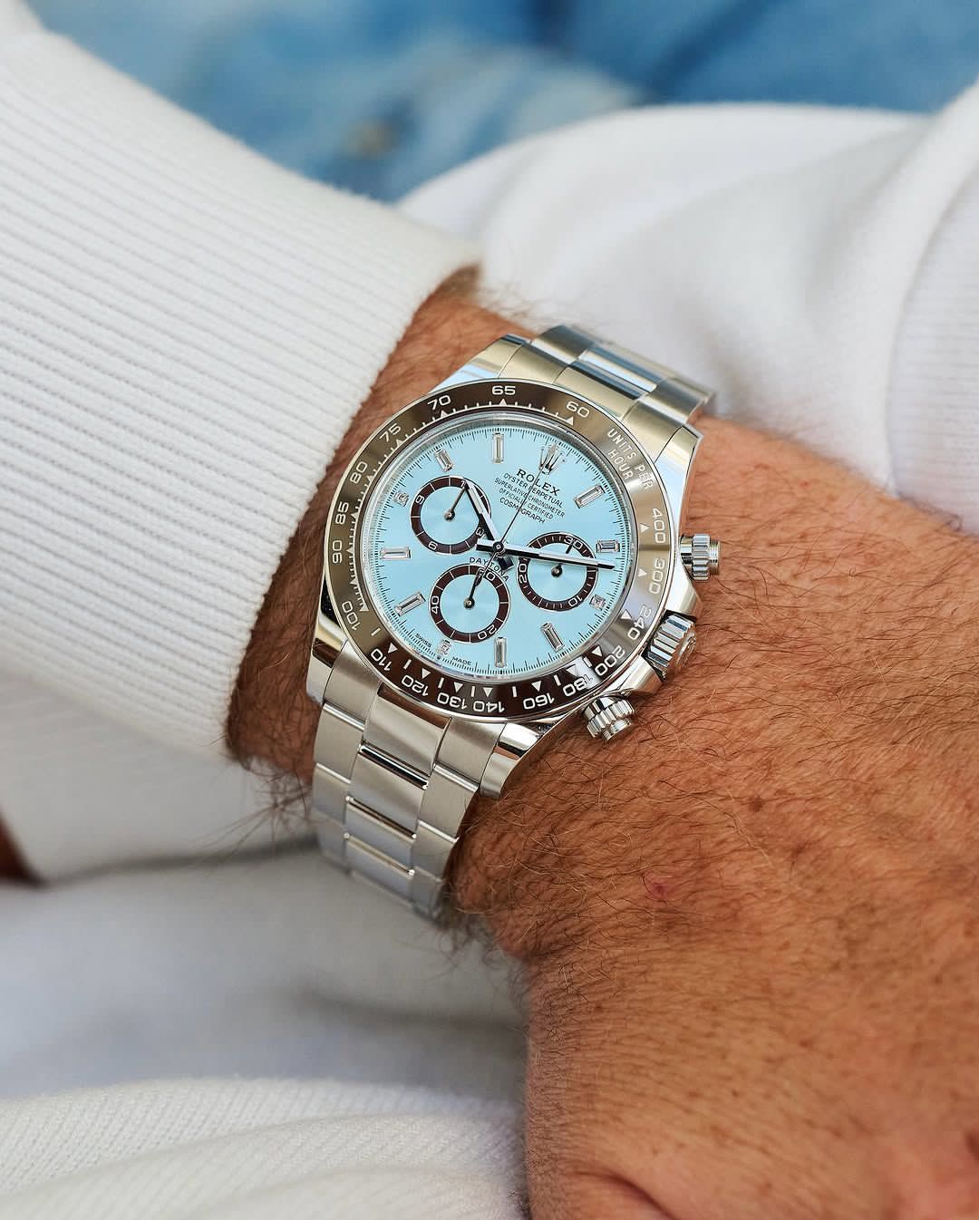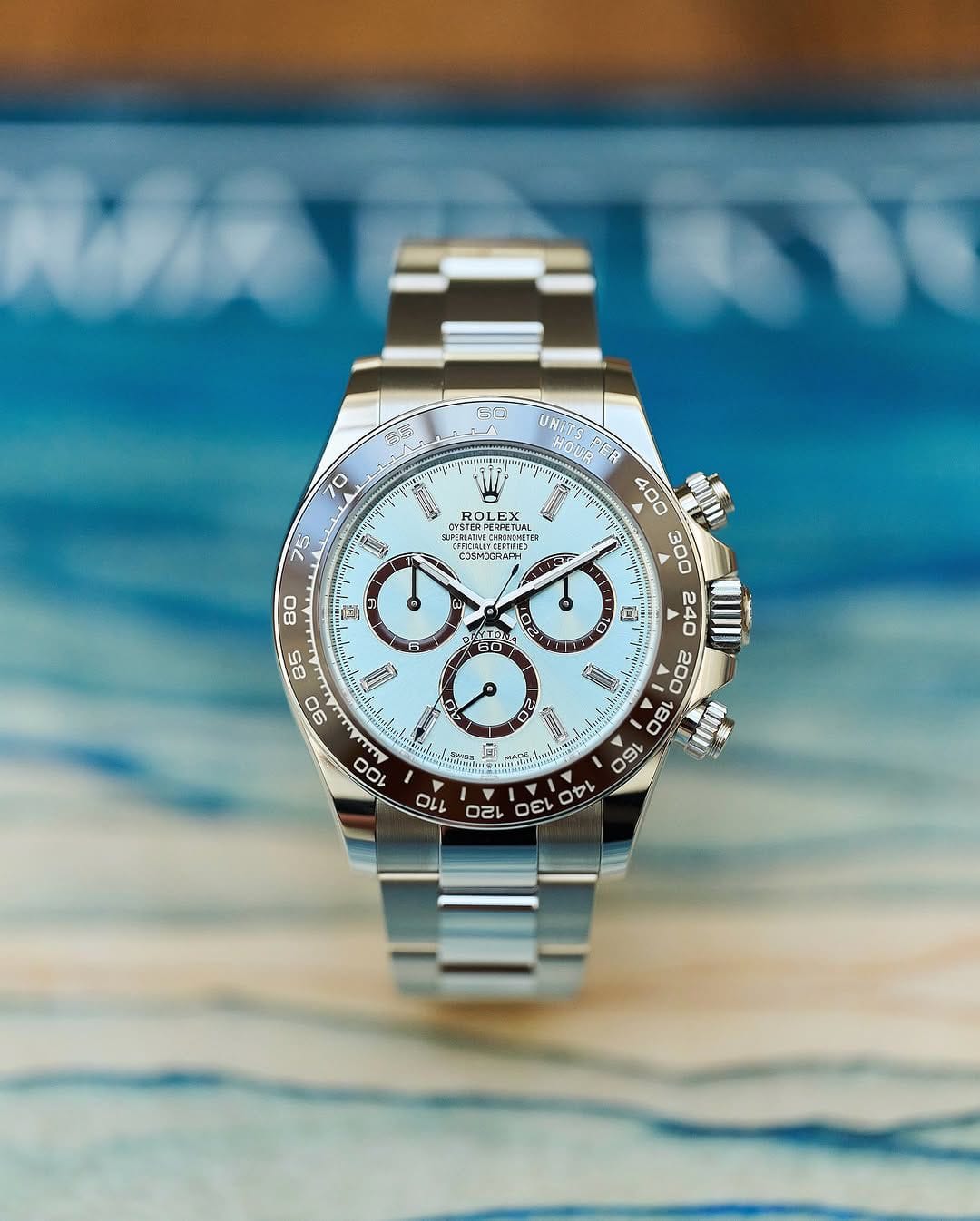 Rolex Cosmograph Daytona, Ice Blue 7AA Automatic Designed to meet the demands of professional racers, this Rolex Cosmograph Daytona embodies the legendary bond between Rolex and motor racing technology. With its platinum ice blue dial and rich brown Cerachrom bezel, this model delivers a premium, powerful and iconic look.