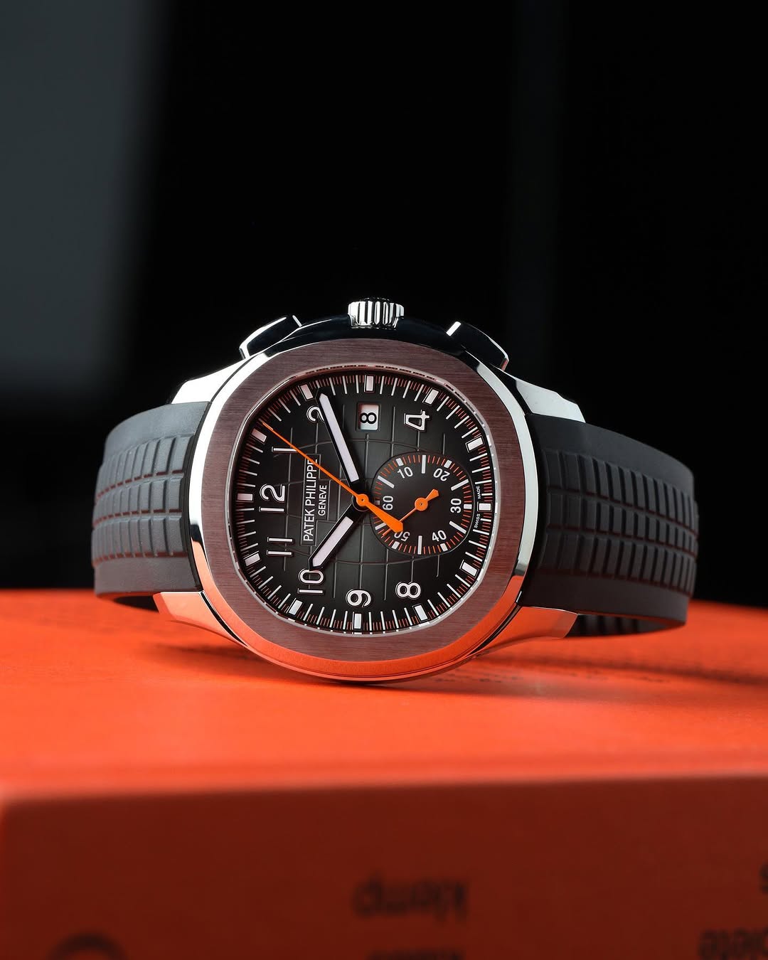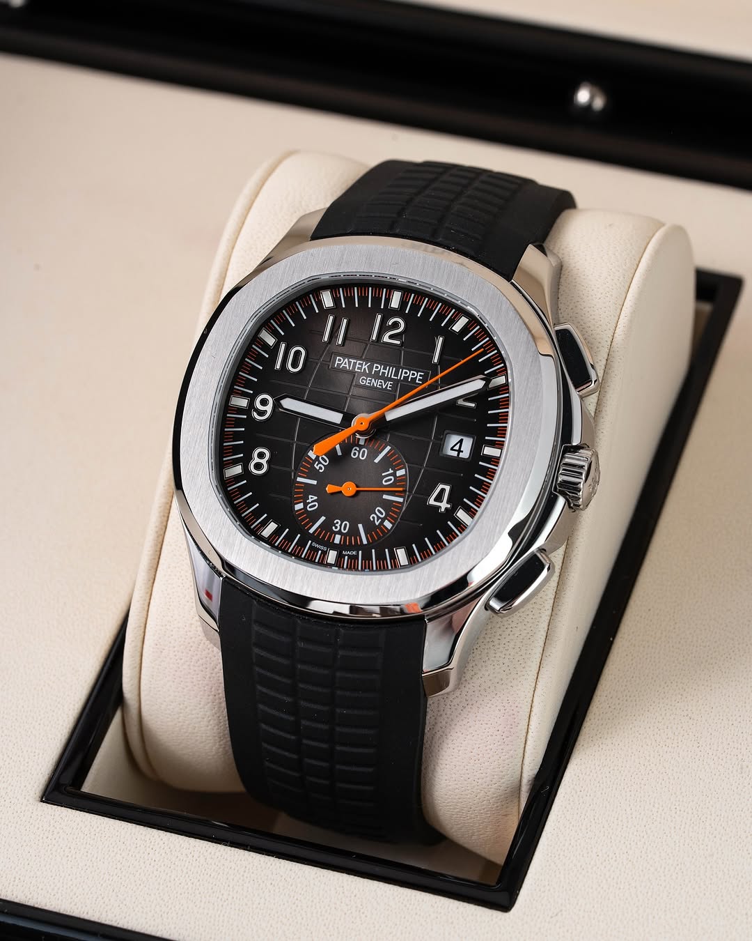 Patek Philippe Aquanaut 5968A-001 7AA premium automatic chronograph watch is a high-end luxury sports timepiece inspired by one of the most iconic Swiss designs. Featuring a bold black embossed dial, orange chronograph accents, and a robust stainless steel case, this watch delivers both performance and elite styling.